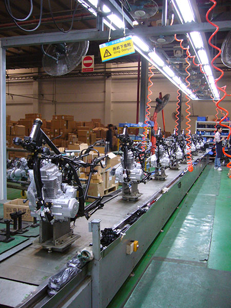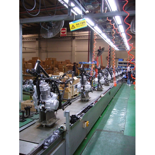 链板输送线是以大节距特种弯板链条为传送介质,带动金属或其它材料链板作循环往复平面运行的一种输送设备。由于线体结构及输送介质较为坚固,所以一般用在较重物品的输送和装配作业现场,每米的最大承重可达到500Kg。常用于各类摩托车、汽车总装部装及焊接生产线,各类制动器、发动机、起动机等装配。 工位数可以根据工艺要求设定,每个工位可配置电源插座,工具箱.