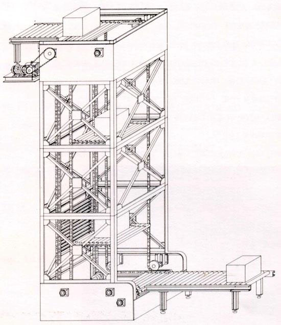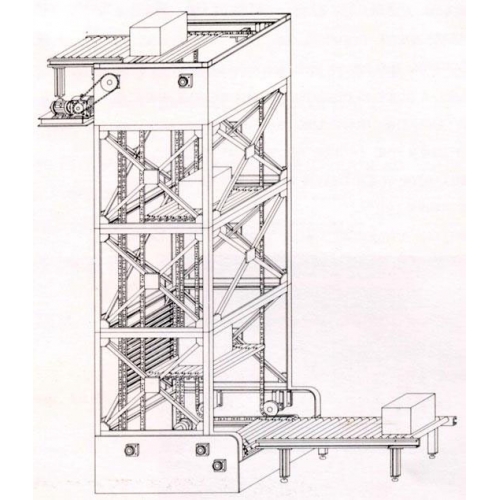 连续式提升机是一种专供纸箱装产品、塑料周转箱等方形体物品进行升降输送的专业设备。该机的主要工作原理是利用四根闭合的链条传动,并在链条上间隔安装一定数量的承载板,传动链带动承载板完成进箱、升降、出箱和回程四个重复循环的步骤,进箱入口配有进箱自动控制滚筒输送线,用于配合升降主机间歇性进箱。