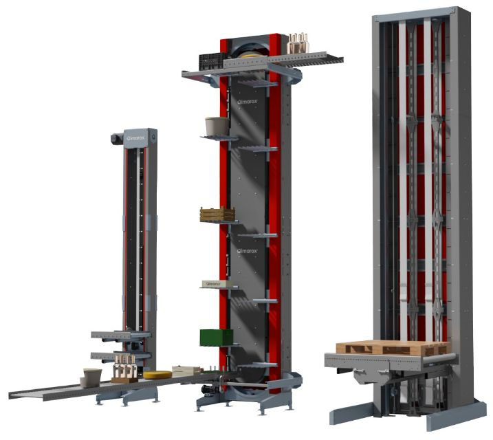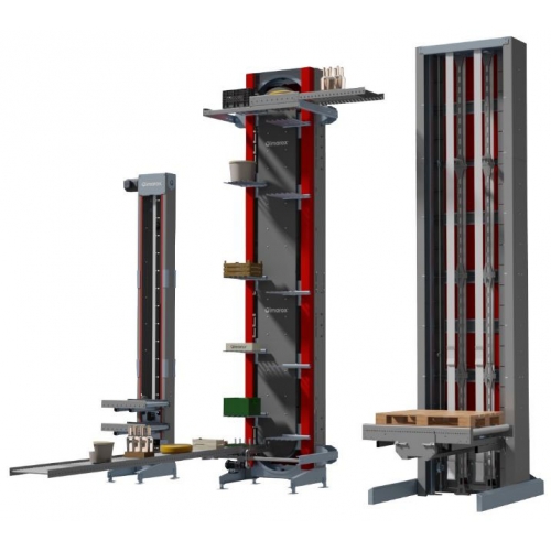 连续式提升机是一种专供纸箱装产品、塑料周转箱等方形体物品进行升降输送的专业设备。该机的主要工作原理是利用四根闭合的链条传动,并在链条上间隔安装一定数量的承载板,传动链带动承载板完成进箱、升降、出箱和回程四个重复循环的步骤,进箱入口配有进箱自动控制滚筒输送线,用于配合升降主机间歇性进箱。
