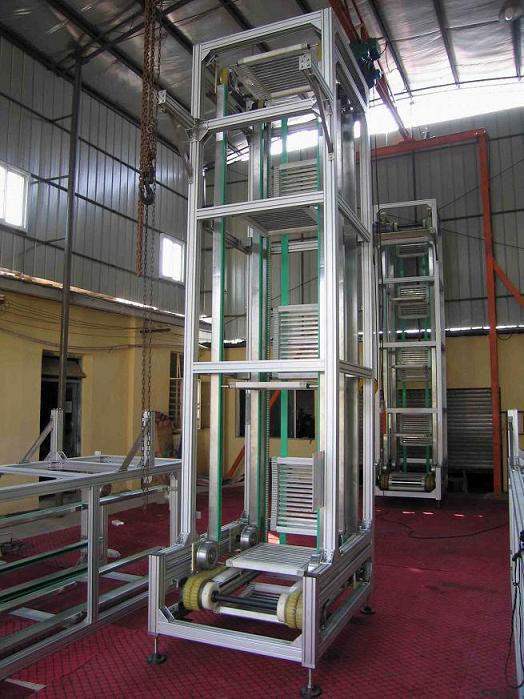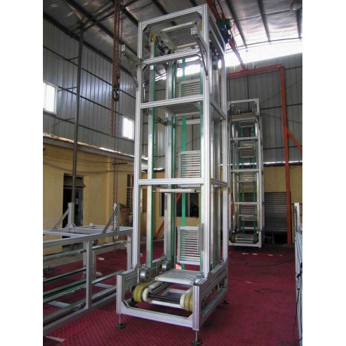 连续式提升机是一种专供纸箱装产品、塑料周转箱等方形体物品进行升降输送的专业设备。该机的主要工作原理是利用四根闭合的链条传动,并在链条上间隔安装一定数量的承载板,传动链带动承载板完成进箱、升降、出箱和回程四个重复循环的步骤,进箱入口配有进箱自动控制滚筒输送线,用于配合升降主机间歇性进箱。
